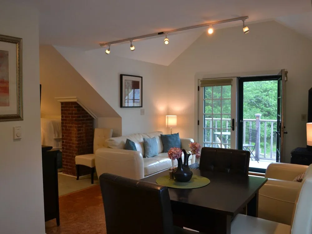 Recently remodeled, second floor, one bedroom apartment located in the heart of historic Blue Hill and Downeast Maine. This gorgeous apartment sleeps up to 3, has a gas fireplace, bamboo, cork, tile, and carpeted floors, free wireless Internet and flat screen HD cable TV and a private balcony overlooking the back gardens, grapevines, and forest.